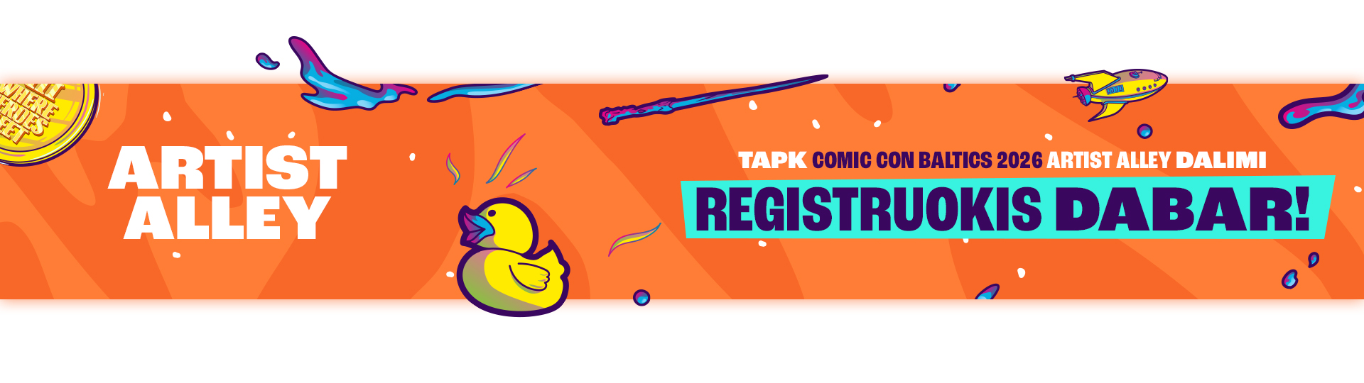 Įsidėmėkite, kad registracija į Menų Alėją baigiasi 2026 m. kovo 20 d. 23:59. Jei norite dalyvauti Comic Con Baltics Menų Alėjoje – iki šio laiko turite pilnai užpildyti registracijos anketą, kurią rasite: ČIA.